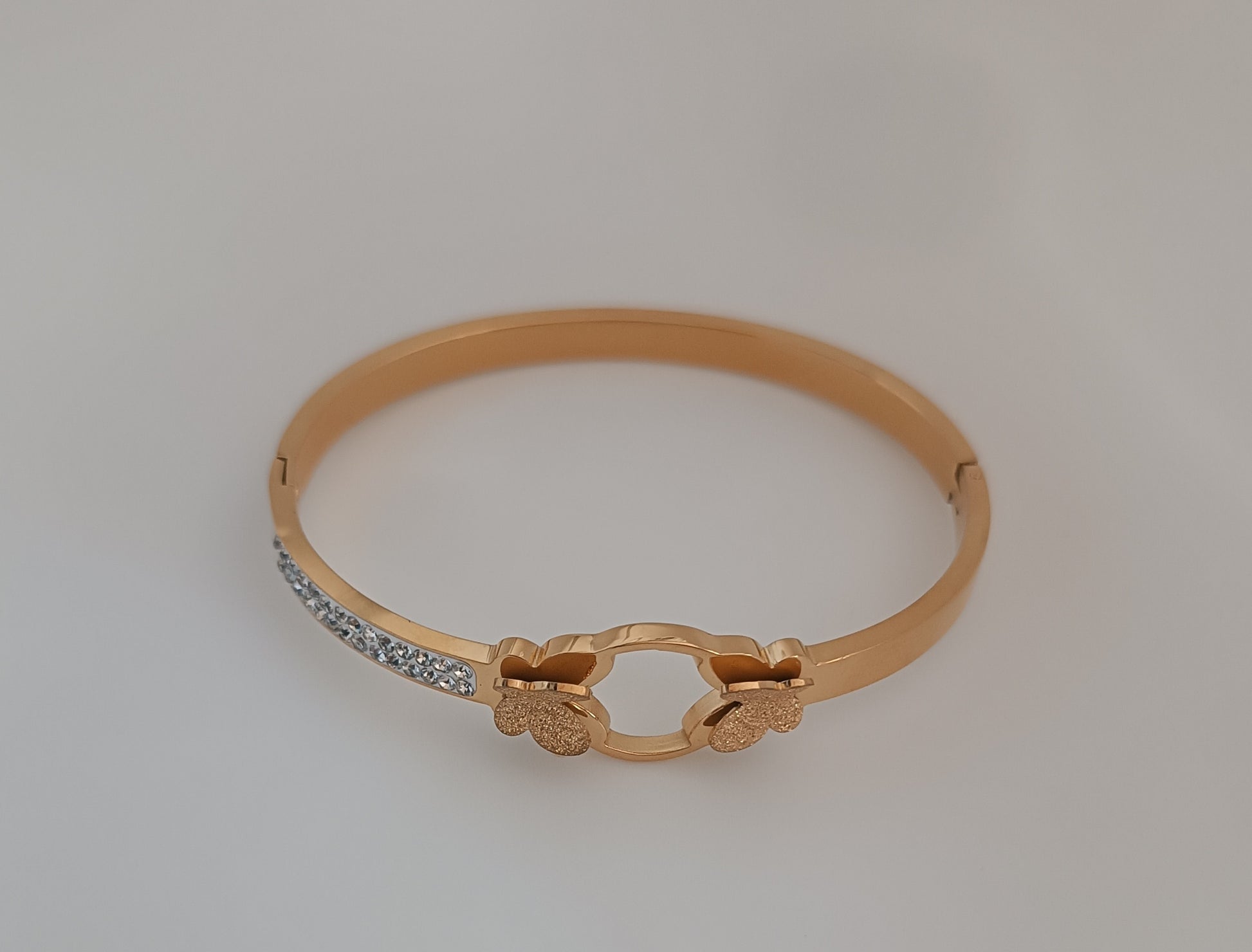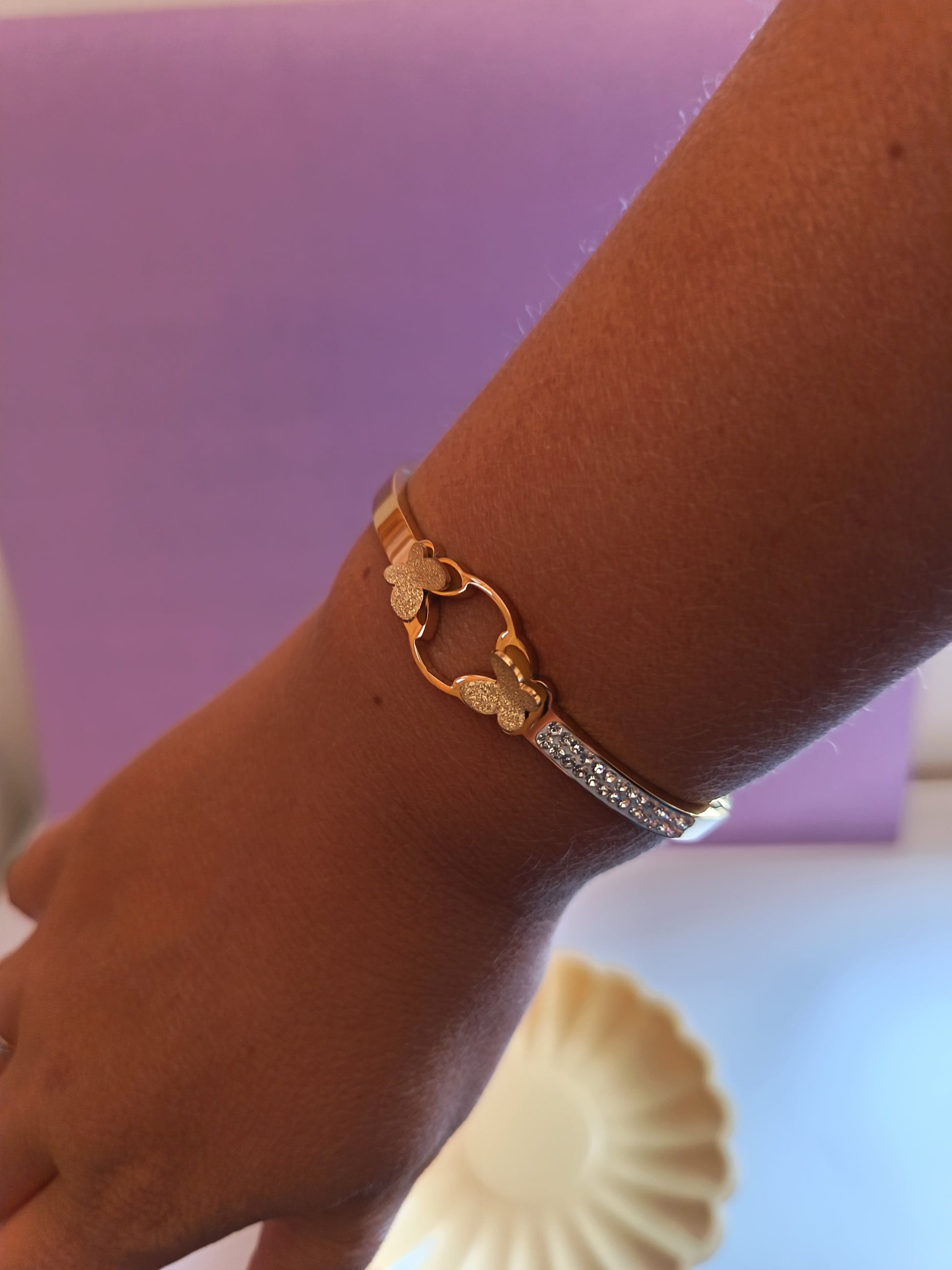 Brazalete de color dorado de acero inoxidable, con 2 mariposas y tira de brillos. Combina comodidad y elegancia para destacar cualquier look.